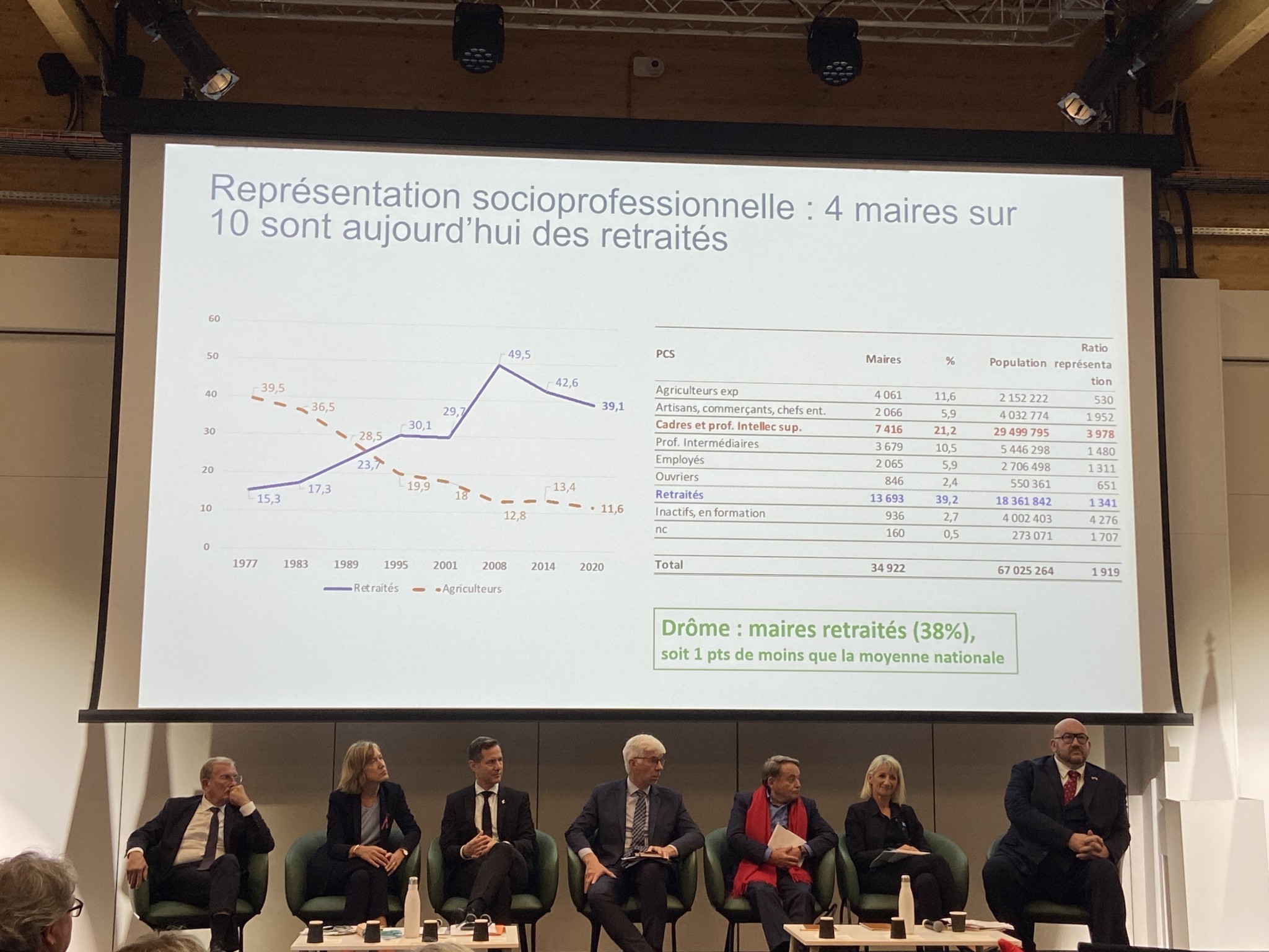 Au-delà de rappeler que l’âge moyen d’un maire dans la Drôme est de 63 ans et que seulement 23,6 % sont des femmes, le chercheur a abordé la « technicisation » des dossiers. « Les appels à projet de l’État pour financer vos projets d’infrastructures… Vous avez rêvé d’être maire pour remplir tous ces dossiers ? », a-t-il interrogé l’assemblée avec une pointe d’ironie en faisant référence à la lourdeur administrative. De quoi faire réagir la salle et Nicolas Daragon qui estime que pour remplir les dossiers « il faut être ingénieur » et qui pense aux maires « seuls dans les communes rurales ». Alors que 39 % des maires sont retraités en France, ils sont 11,6 % à être agriculteurs. Un nombre qui diminue d’année en année mais qui est cohérent avec la diminution de la population agricole. Enfin, autre sujet mis en avant par Martial Foucault, les incivilités recensées sur les élus locaux : 67 % des maires drômois sont concernés.