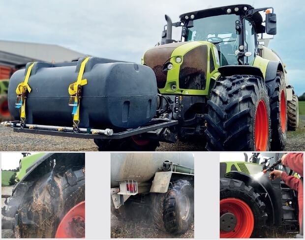 Ce nettoyeur embarqué pulvérise de l’eau sous pression via l’hydraulique du tracteur et l'applique par jet localisé sur les roues du tracteur et des équipements attelés (porte-buses intégrés dans les garde-boue), avec une gestion automatique essieu par essieu. Un tuyau de 20 m sur enrouleur complète le dispositif.