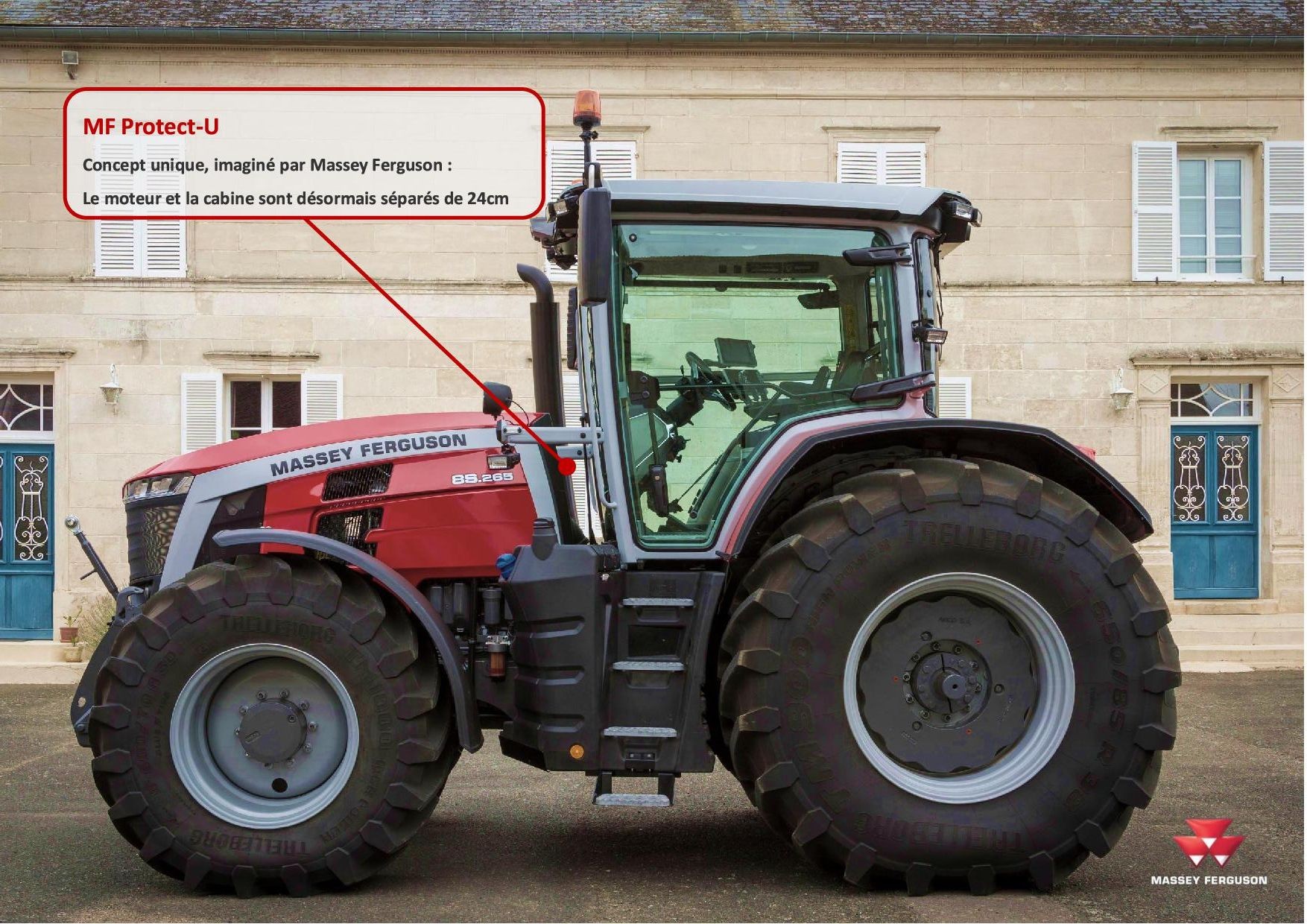 Le concept MF Protect-U offre un espace de 24 cm entre le moteur et la cabine et contribue au design unique de ce tracteur. L'utilisateur bénéficie d'une excellente visibilité et d'un confort optimal. Le moteur entièrement encapsulé et isolé de la cabine réduit le bruit et les vibrations Ce système isole également la cabine de la chaleur et améliore le refroidissement et l’efficacité du moteur, pour un temps de fonctionnement maximal.
