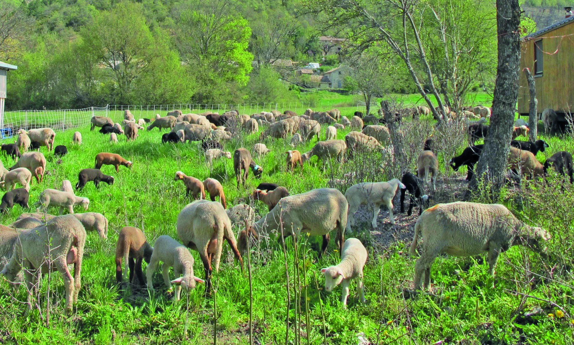 À Ballons, petit village du canton de Séderon aux confins de la Drôme et des Hautes-Alpes, Claire Lapie et Yann Rudant élèvent un troupeau de brebis de races mérinos d’Arles et mourérous. Elle, ingénieure agronome originaire de Chalons-en-Champagne, ex-cheffe de projet « protection d’espaces naturels » en vallée de la Somme puis en Ariège, est arrivée dans la Drôme en 2012 pour se lancer dans une nouvelle orientation, le pastoralisme. Elle crée en 2015 « La colline aux moutons », une exploitation sur laquelle elle élève un troupeau de 200 brebis qui pâturent toute l’année sur les versants de la Montagne de Chabre, autour des trois hameaux de la Calandre, le Vesque et les Granges, profitant sur 300 hectares de la végétation sauvage et diversifiée évoluant au fil des saisons et garantissant une viande douce et savoureuse. Le foin et les céréales consommés en hiver proviennent de fermes bio situées à moins de 15 kilomètres de l’exploitation. Les agneaux grandissent lentement à leur rythme, les femelles sont sélectionnées pour le renouvellement du troupeau.