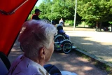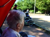 Sagement assise sur la banquette, plaid sur les genoux et une ombrière la protégeant du soleil, Monique est prête pour partir. En neuf mois, il s’agit de sa quatrième balade avec l’association. Elle a même annulé la visite de ses nièces pour pouvoir y participer. Une fois la ceinture bouclée, Patrick enclenche la machine. Habitant de la commune, il en connaît les moindres recoins et anecdotes. « J’ai rédigé un livret que je distribue à tous les bénévoles, afin de leur donner quelques anecdotes quant à l’histoire et au passé de Sainte-Foy-lès-Lyon », explique-t-il, tout en invitant Monique à porter son regard sur le portail d’une propriété bourgeoise, laissant apparaître un jardin arboré et fleuri. « À l’époque, des industriels de l’automobile et de la soie résidaient ici et souhaitaient faire concurrence au parc de la Tête d’or en aménageant de nombreux parcs », raconte-t-il à Monique, fascinée par la taille des arbres et prête à reconnaître les tilleuls qui bordent les allées. Pour rendre cette balade d’une heure et demie la plus agréable possible, le conducteur choisit de passer par les nombreux parcs de la ville. Le premier arrêt se fait ainsi sur une place, célèbre pour sa vue surplombant Lyon et sa métropole. L’occasion, pour les Lyonnais et Lyonnaises d’origine, d’échanger quelques bribes de souvenirs. « Ce n’est pas pour rien que Sainte-Foy-lès-Lyon s’appelle le balcon vert de Lyon », sourit Patrick, avant de reprendre la route pour un second parc, où joueurs de pétanque et enfants se retrouvent sous un soleil de fin d’été. « Il arrive que les personnes transportées échangent des paroles ou un geste avec les enfants, raconte Patrick. Finalement, le vélo est un prétexte et un moyen de se déplacer plus facilement, puisque le plus important, c’est de sortir les résidents et de créer du lien intergénérationnel… On s’arrête pour provoquer une discussion lorsque l’on croise des personnes prêtes à échanger ou des enfants curieux. »