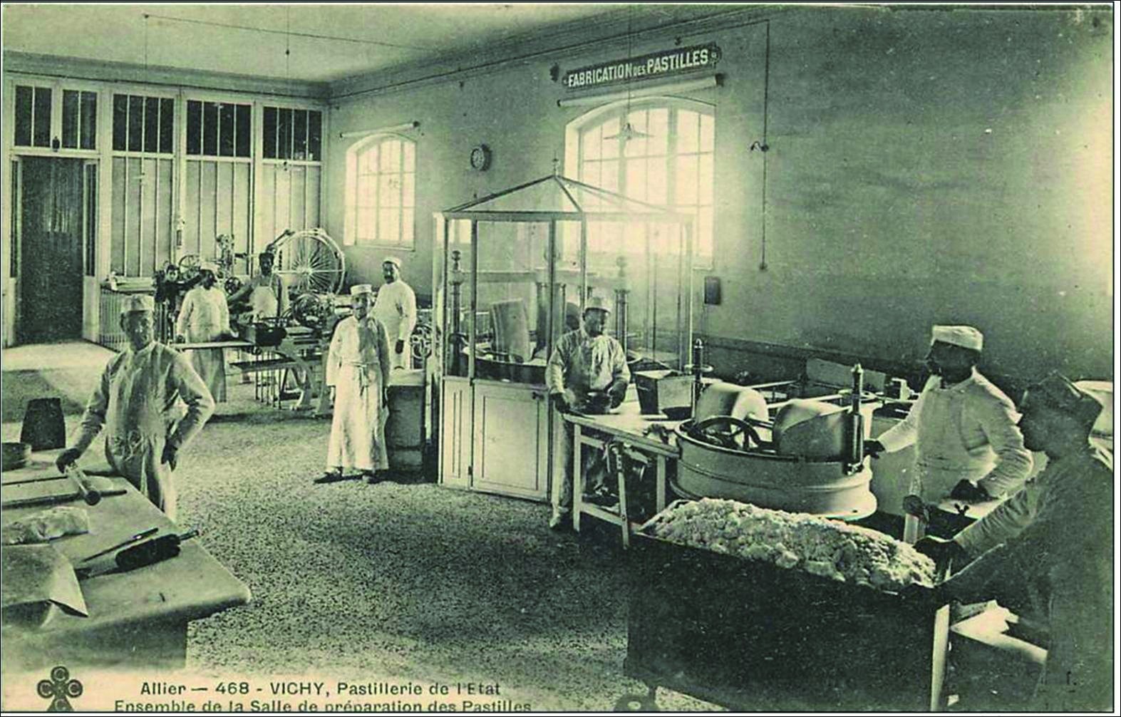 l’impératrice Eugénie, qui reconnut les pastilles de Vichy comme produit « original ». Très consommées alors par l’aristocratie française, probablement influencée par cet avis impérial, ce n’est pourtant que 58 ans plus tard, en 1914, qu’elles furent vendues librement comme une confiserie. Son essor doit beaucoup à la famille Moinet. La plus ancienne confiserie de Vichy, toujours en activité, est une affaire familiale qui fabrique la pastille de Vichy depuis 1852, soit sept générations !
