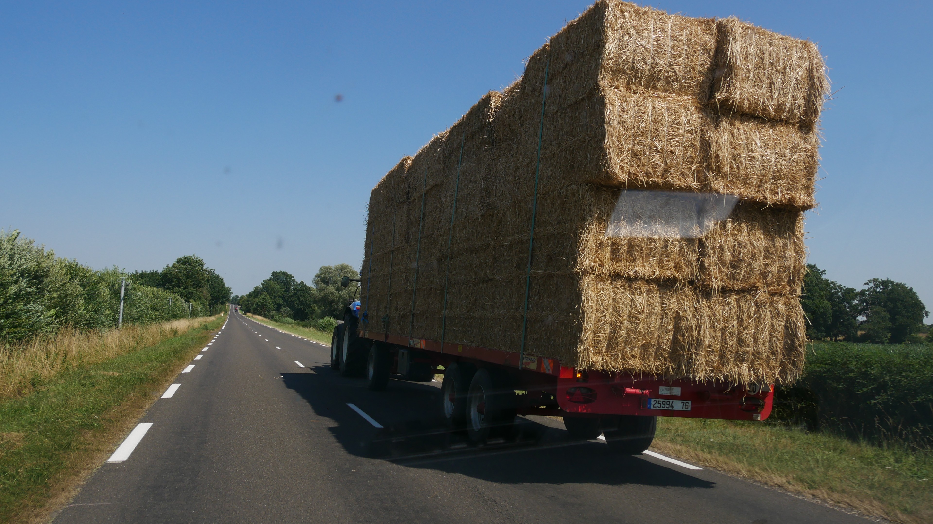 Les ensembles agricoles mesurant jusqu’à 22 m de long peuvent circuler à condition de disposer d’au minimum un gyrophare visible tous azimuts et de catadioptres latéraux, et ceux allant jusqu’à 25 m se doivent d’être précédés d’un véhicule d’accompagnement avec un panneau Convoi Agricole. Crédit : L. Vimond