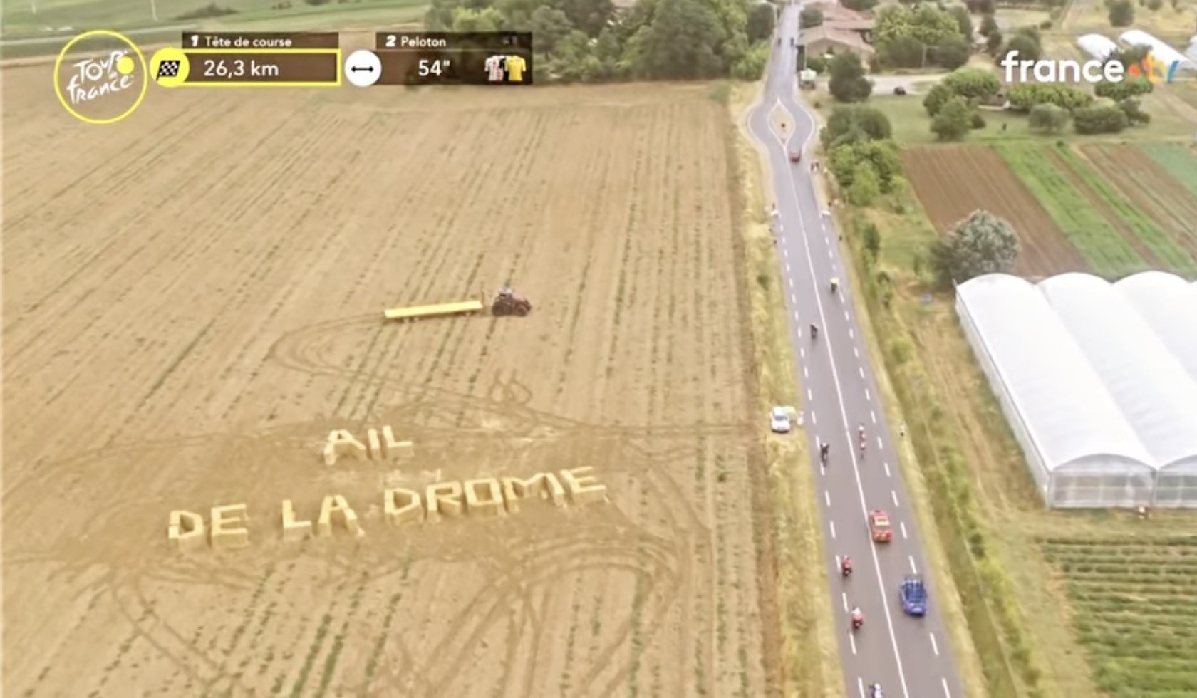 Autre production mise en avant lors de la 17e étape du Tour de France reliant Bollène à Valence, l'ail de la Drôme. « Les producteurs ont uni leurs forces pour réaliser un coup de com’ aussi simple que génial : écrire "Ail de la Drôme" avec des bottes de pailles, en plein champ, pour que le message soit capté depuis l’hélicoptère », publie l'Association des producteurs d'ail de la Drôme (Apad) sur sa page Facebook. Et ce fut un succès. »