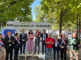 Depuis plusieurs mois déjà, ils multiplient les actions pour dénoncer les conséquences catastrophiques d'un tel accord pour l'élevage français, mais aussi pour les consommateurs. Ce mercredi 9 juillet, devant l'ambassade du Brésil à Paris, ils ont exhorté le président de la République et le gouvernement français à lever toute ambiguïté sur leur position vis-à-vis de l'accord. « Nous demandons au président Macron un engagement clair et public : non à la ratification, non à la scission de l’accord, non à la logique du fait accompli. Nos territoires ruraux et les agriculteurs ne peuvent pas être les variables d’ajustement de tractations parallèles », rappelle Christian Bajard, éleveur en Saône-et-Loire, coordinateur du berceau des races à viande du Massif central.