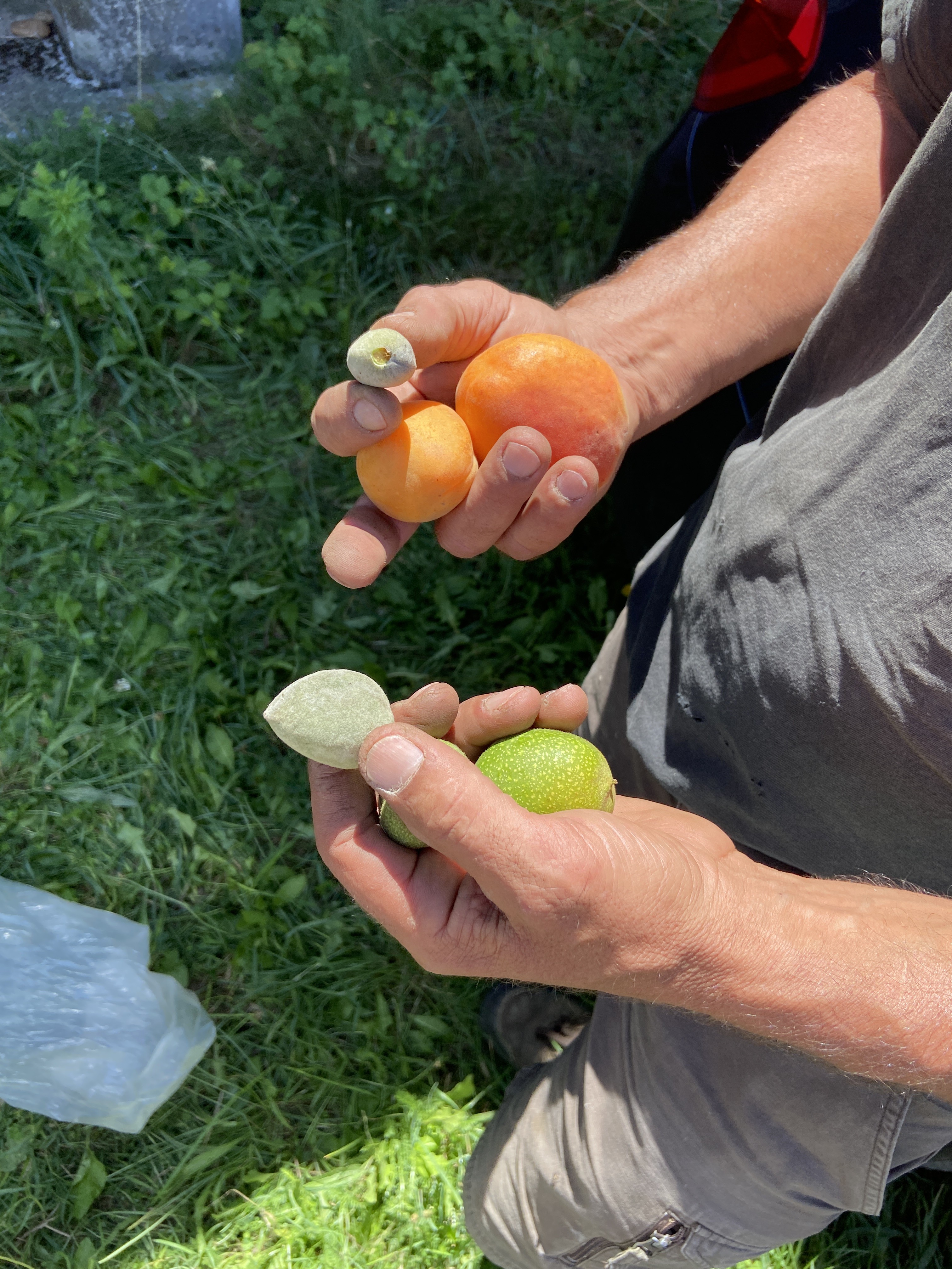 Stéphane Pousse a ramené deux abricots, deux amandes et deux noix qui n’ont pas reçu la même quantité d’eau : la différence de calibre saute aux yeux. ©ME-AD26
